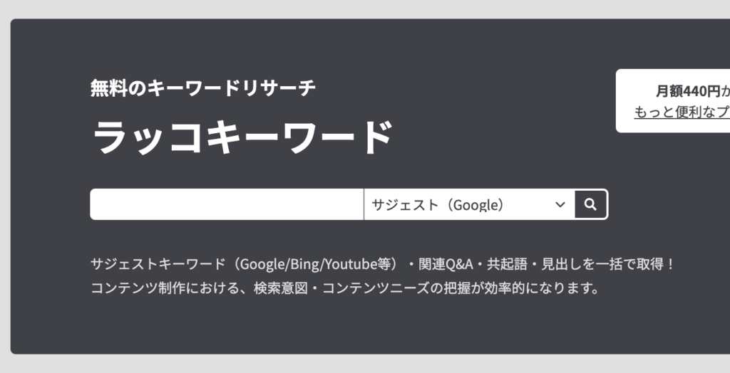 ラッコキーワードは、GoogleやYouTube、Amazonなどの